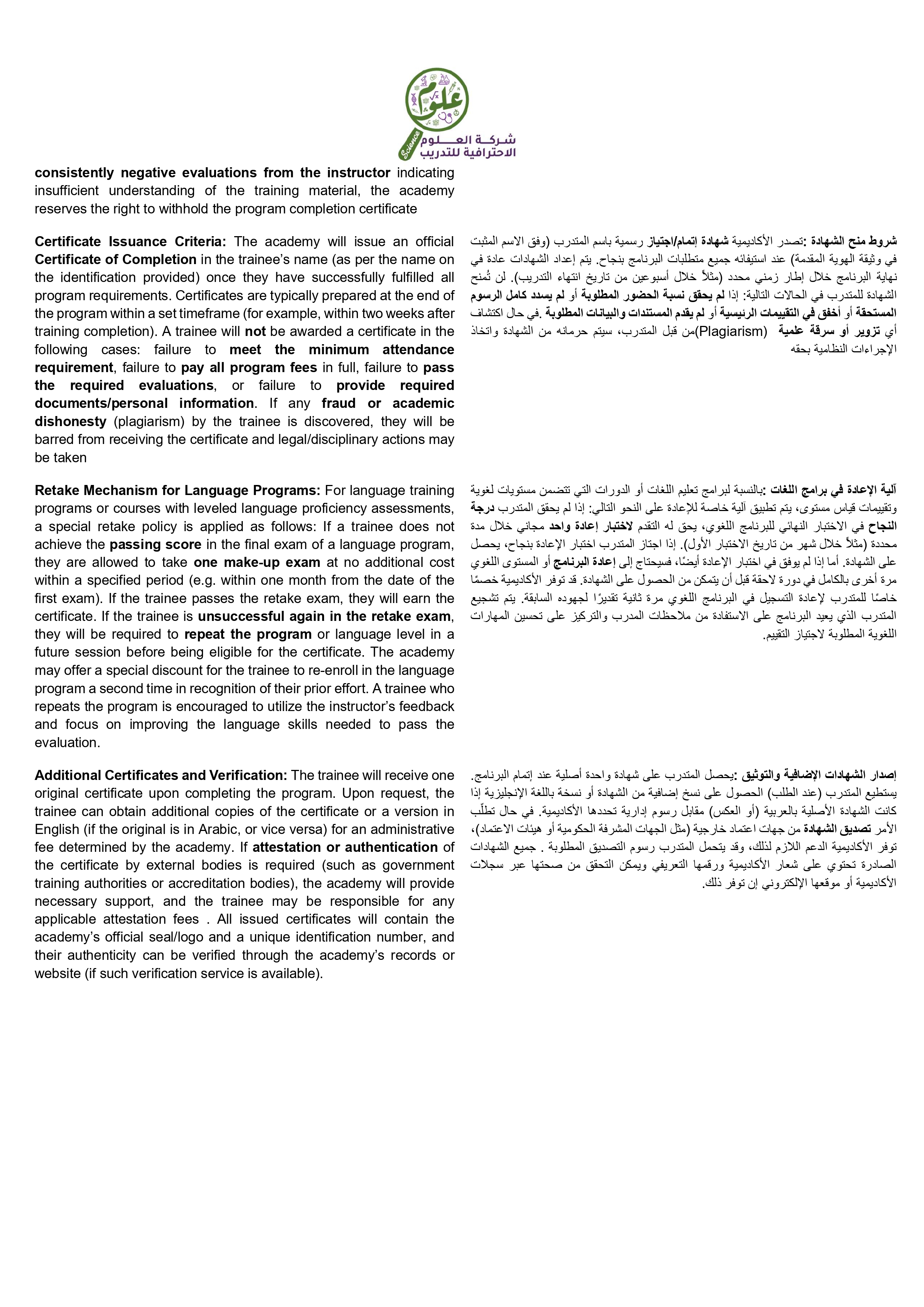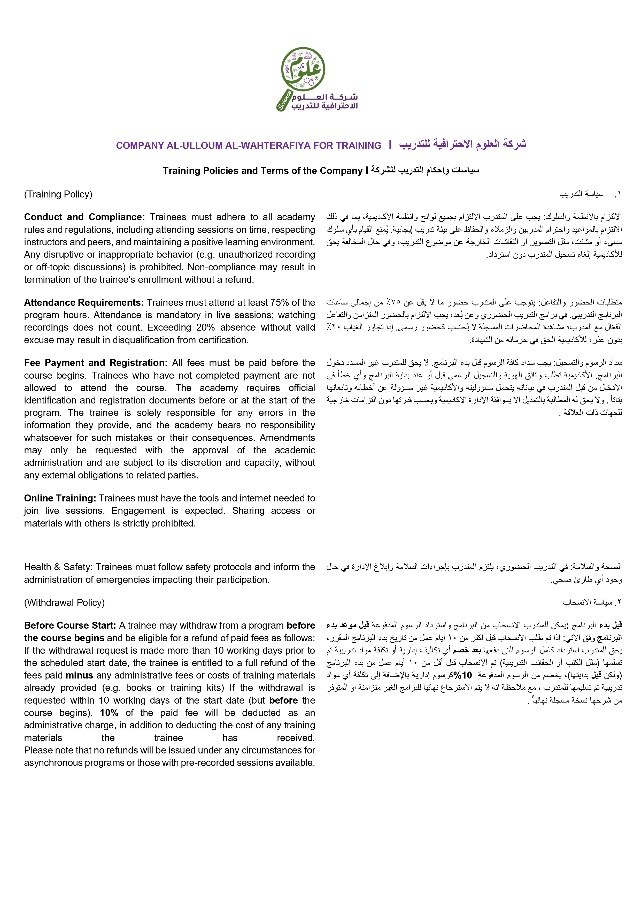 2. يقوم المتدرب بتسديد الرسوم الدراسية المستحقة عليه في أوقاتها المحددة وفي حالة عدم القيام بذلك يحق لشركة العلوم طي قيد المتدرب .