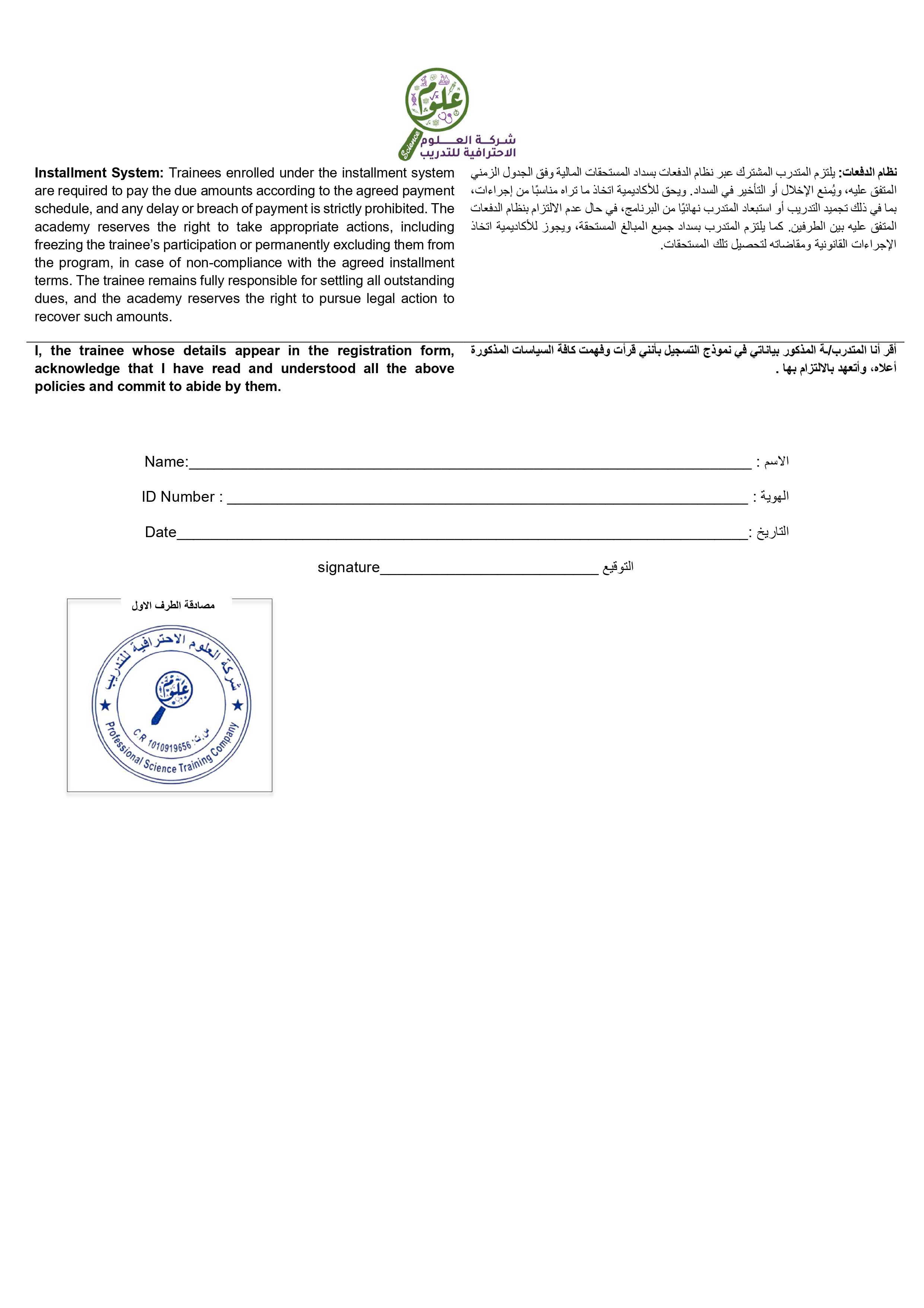 3. يتعهد المتدرب بأن جميع البيانات الواردة في طلب الالتحاق صحيحة ومطابقة ويقر بمسئوليته عليها. 4. يتعهد المتدرب بأن أرقام الهاتف الموجودة في سجله صحيحة وفي حالة تغيرها يجب عليه إبلاغ إدارة الشركة بالأرقام الجديدة. وفي حالة عدم قيامه بذلك تكون للشركة غير مسئوله عن أي أضرار تلحق بالمتدرب من جراء ذلك (موعد اختبار _ الوثائق بمنصة منار - إلى أخره ....)